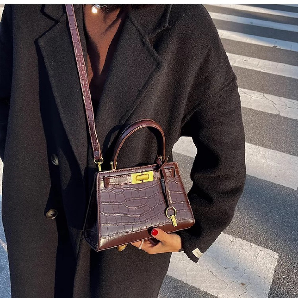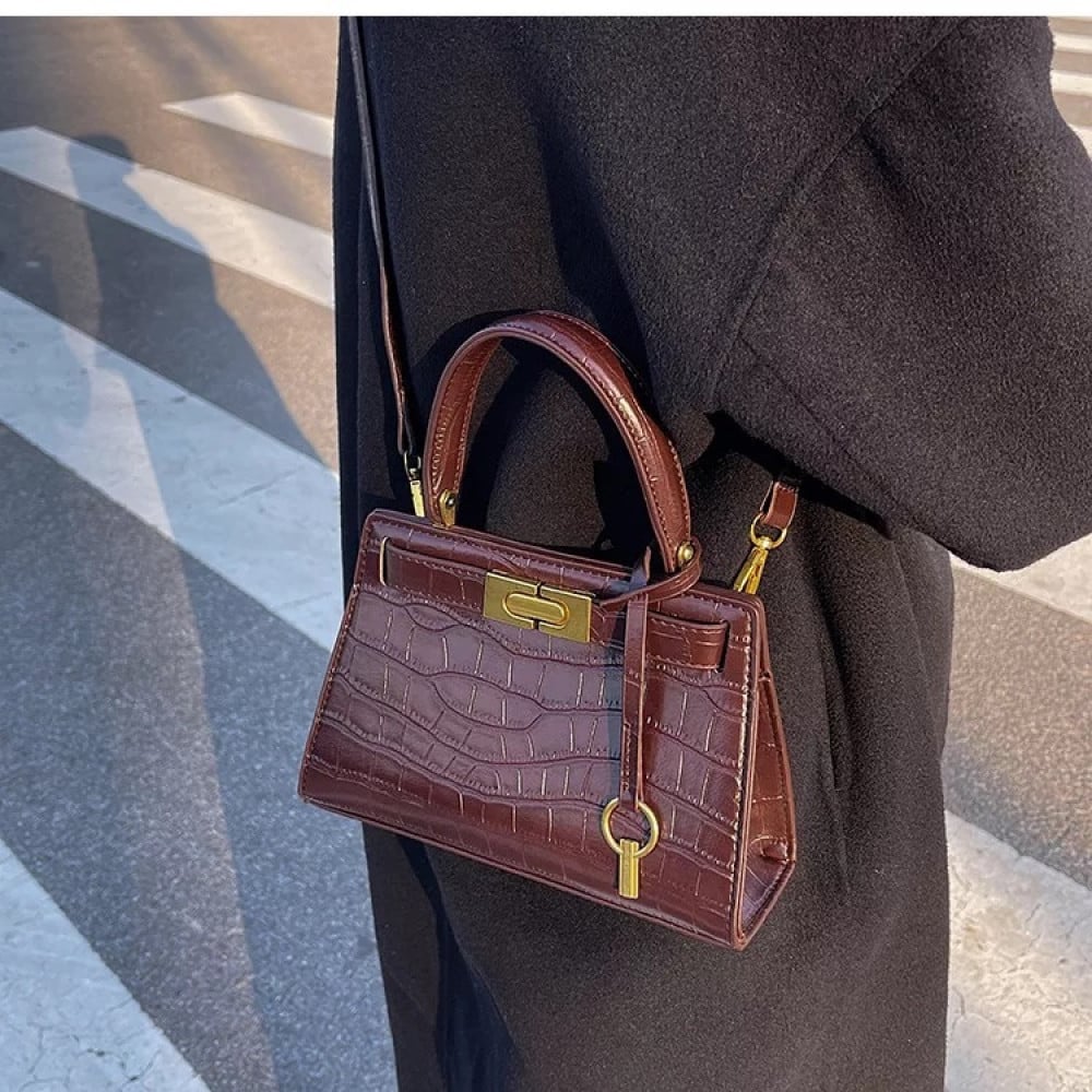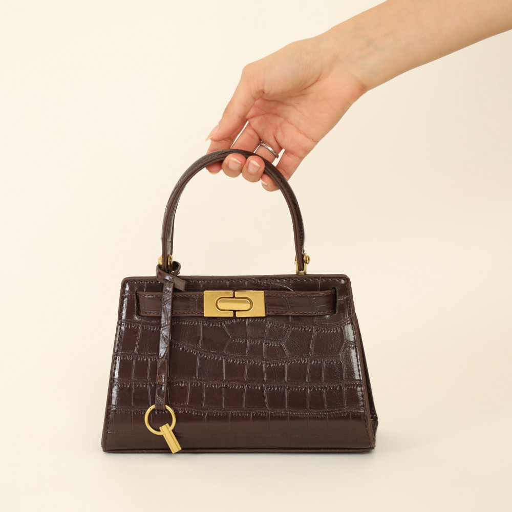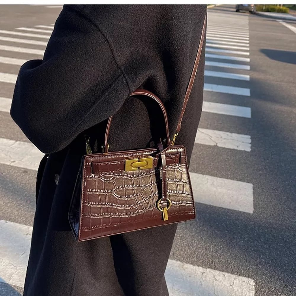 مقبض علوي فردي، حمالة كتف قابلة للتعديل، حلية معدنية بلمعان ذهبي.