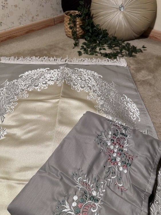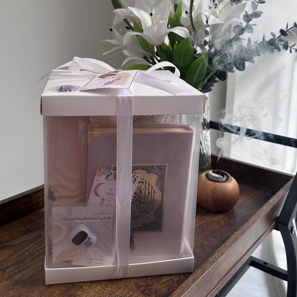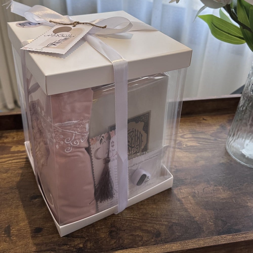 محتوياتها ( طقم سجادة - جلال صلاة مطرز مفتوح من الامام بربطه جانبيه🪡 - مصحف - فاصل قرآن - خاتم تسبيح )